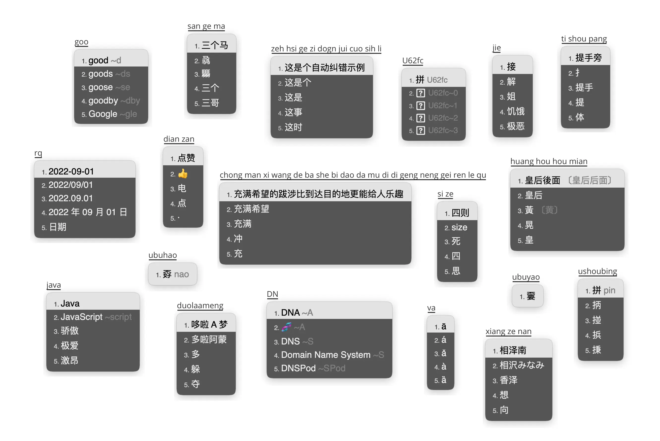 在为自己的 Rime 词库 进行修订时,发现了很多以前不曾了解的汉字规范。 从修订记录里翻出了一些,算是自己的吐槽吧。。。 模棱两可 「滴里耷拉、滴里搭拉、滴哩答拉」→「嘀哩嗒啦」,「啰哩啰唆」→「啰里啰唆」,「劈哩叭啦」→「噼里叭啦」,「嘁哩喀喳」→ 「嘁里咔嚓」。。。 为什么上面这些除了「里」都是口字旁,却不用同样是口字旁的「哩」呢? 「暗淡」「黯淡」。 「呆会」「待会」,表「停留」时,《现汉》未作推荐但有一个「待dāi」的一声读音专门用于这个意思,《现规》推荐使用「呆」。 「标识zhi」「标志」,「标识zhi」一直是「标志」的异形词,但《现汉》6、7 开始有了「标识shi」,《现规》直接推荐使用「标志」。 「勾拳」「钩拳」,Hook 本就是钩子的意思,我站「钩拳」。 「抗不住、抗得住」「扛不住、扛得住」。 「嚎叫」「号叫」「嗥叫」。 「定亲」是「定」,「订婚」是「订」。 各种「词」与各种「辞」。 「贻 X」与「遗 X」。 「杆」与「竿」。 「得意洋洋/洋洋得意」「得意扬扬/扬扬得意」。 「发愤图强」「奋发图强」。 「鱼钩」「渔竿」「钓鱼竿」。 「嘁嘁嚓嚓」→「嘁嘁喳喳」,「嘁哩咔喳」→「嘁里咔嚓」,不同的地方用不同的 cha。。。 「下功夫」「费工夫」。 「悲催」「悲摧」。 「备受」「倍受」。 「比划」「比画」。 「西瓜子」「西瓜籽」。 「鄙人」「敝人」。 「闭塞」「蔽塞」。 「侧足」「厕足」。 「闺中密友」的「闺密」与「闺蜜」。 「激凸」「激突」。 「叫作」「叫做」。 「做出」「作出」,以及各种「做 X」和「作 X」。 「绝不」「决不」。 「谩骂」「漫骂」。 「避邪」「辟邪」。 「泄气」「懈气」。 「佚/轶/逸」+「名/事」。。。 「蒸气」「蒸汽 = 水蒸气」。 「属望」「瞩望」。 「启航」「起航」。 「乐呵」「乐呵呵」「乐乐和和」。 「当啷」与「郎当」。 「作何」「做何」。 「订做」「定做」。 「订制」「定制」。 「实验」「试验」。 「畜生」「牲畜」。 「无名火」「无明火」。 「去除」「祛除」「驱除」。 「碾压」「碾轧」 「阵势」「阵式」 过于细致的拆分 很多字词没有作为异形词,而是分别赋予了不同的意思,或运用在不同的语境下。 校对网还看到一个 校对疑难问题分享搜集。 细致的 cha:「道路分岔」「树木分杈」「头发分叉」「河流分汊」,还有个「裤裆开衩」。😅 「群山曼延」「杂草蔓延」「洪水漫延」。 「声音/水势洪大」「规模宏大」。 「作客」「做客」。 ...